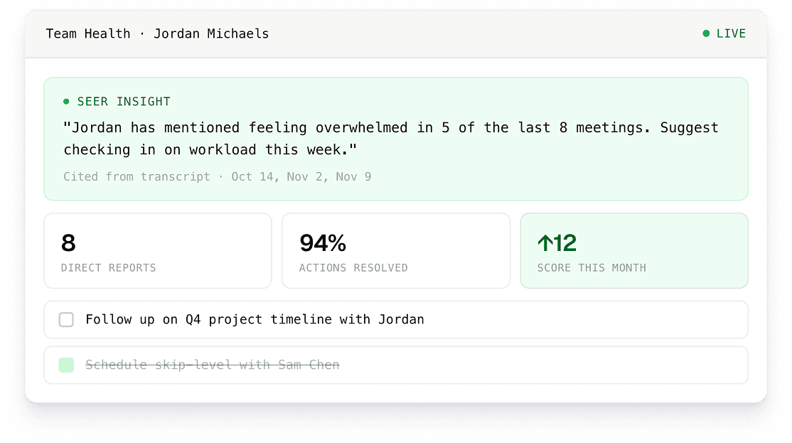 Seer analyses every 1:1, surfaces what matters, and acts on it, so managers can focus on managing.