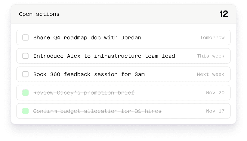 Seer captures every action item from every 1:1. Before your next meeting Seer will manage expectations, chase anything outstanding and briefs you on what is ready
