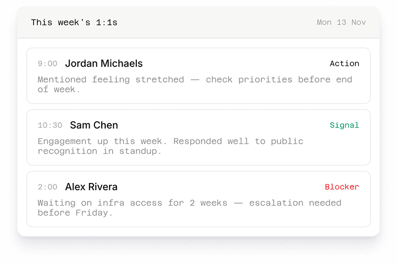 Before every 1:1, a summary of last time, what's outstanding, and what to watch for